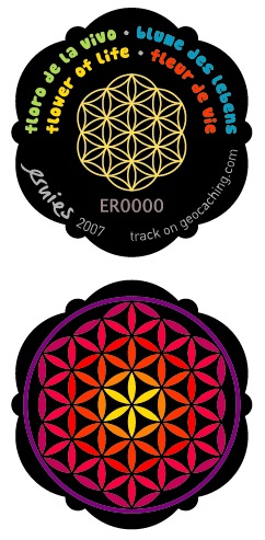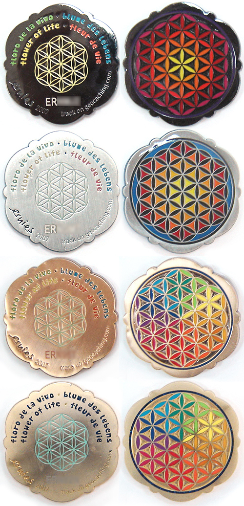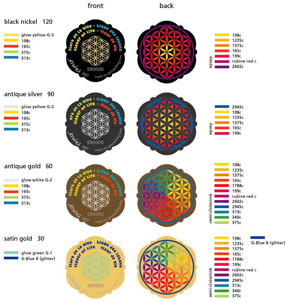 there will be several rainbow colors on the back. on the front side, the so called seed of life (7 circles) is depicted (with glow-in-the-dark color).