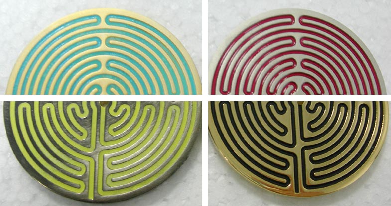 the front side is plain metal colour (except writing on the top: black), the labyrinth outlines are raised.