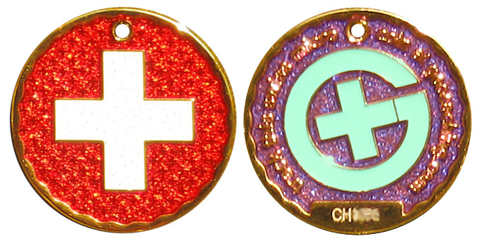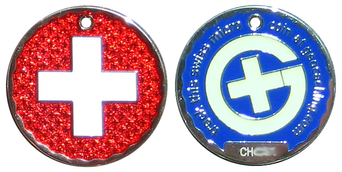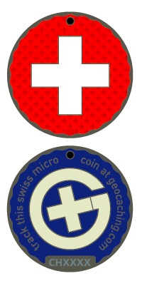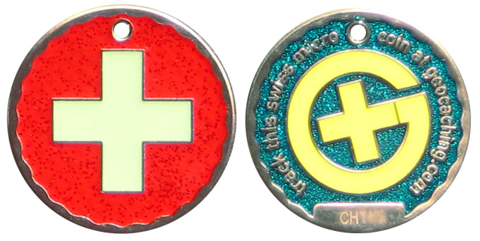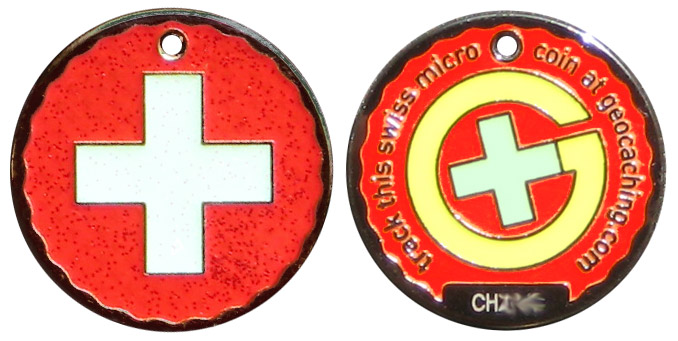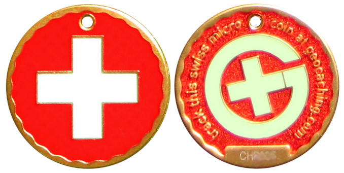 back shows public domain geocaching Gx logo with incorporated swiss cross.